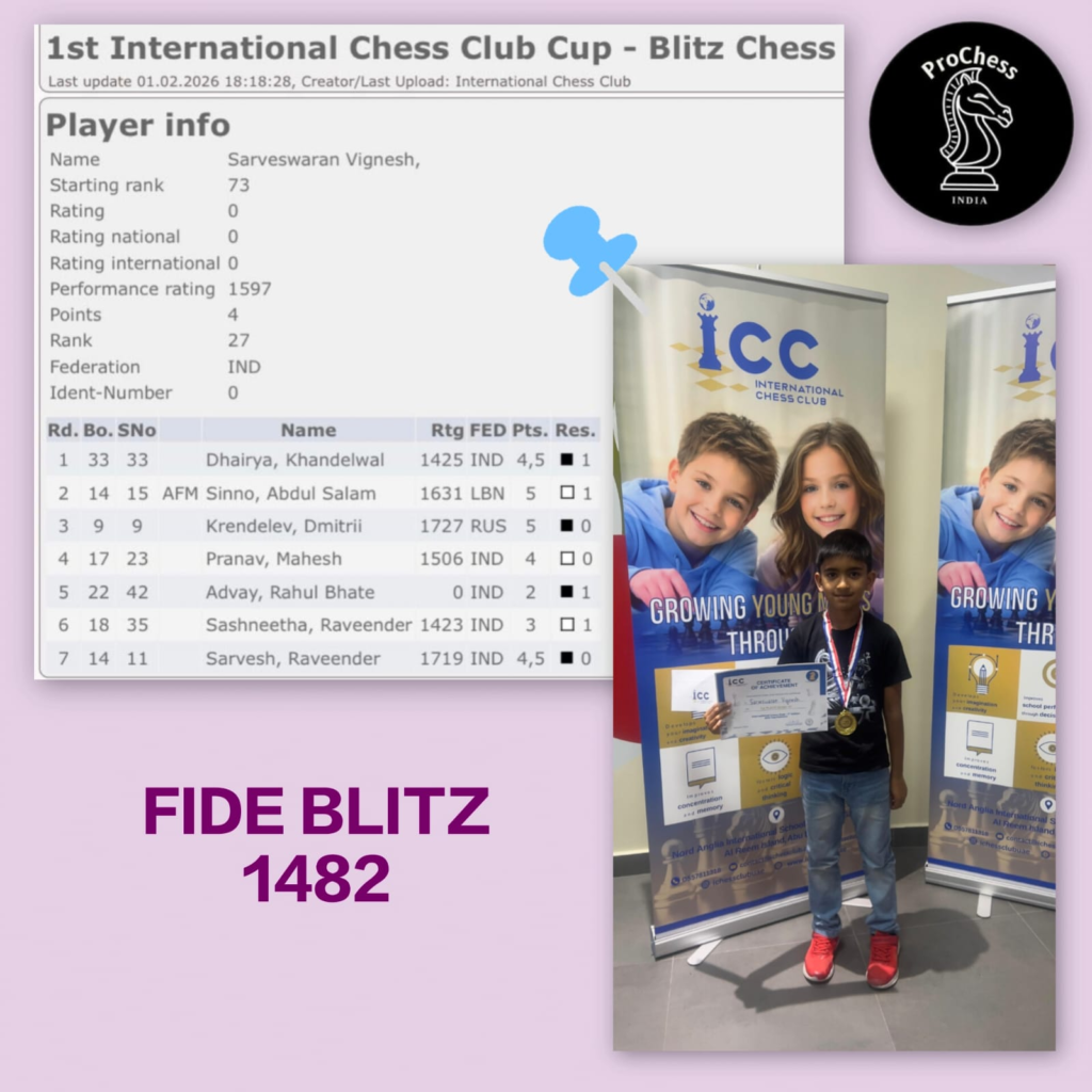 At ProChess INDIA, we strongly believe that consistent training, structured coaching, and tournament exposure shape true champions. We are incredibly proud to celebrate the outstanding achievement of our student, ACM Sarveswaran, who delivered a remarkable performance in the Rapid and Blitz Chess Tournaments held last weekend.