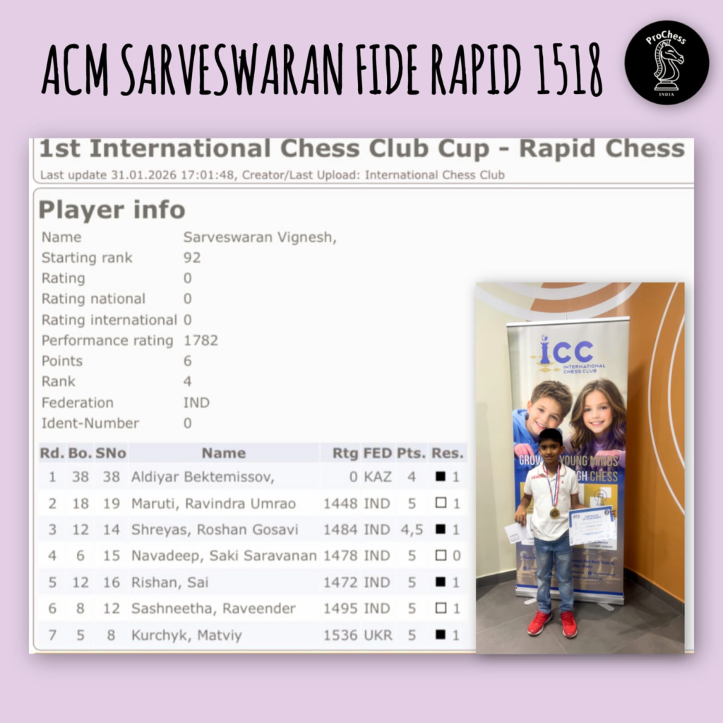 ACM Sarveswaran’s strong and consistent performance across both Rapid and Blitz formats is truly inspiring. His journey reflects how dedication, regular practice, and expert chess guidance can lead to outstanding results at a young age.