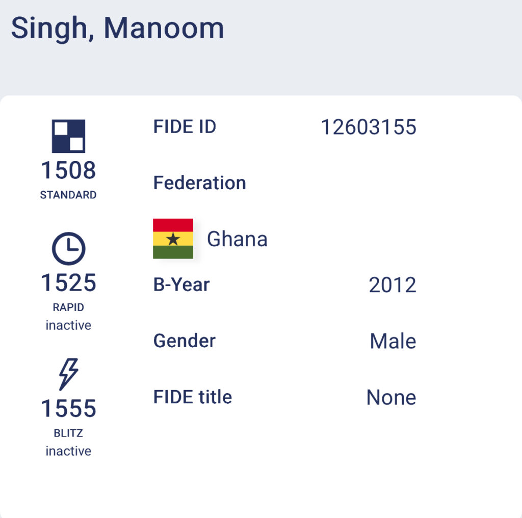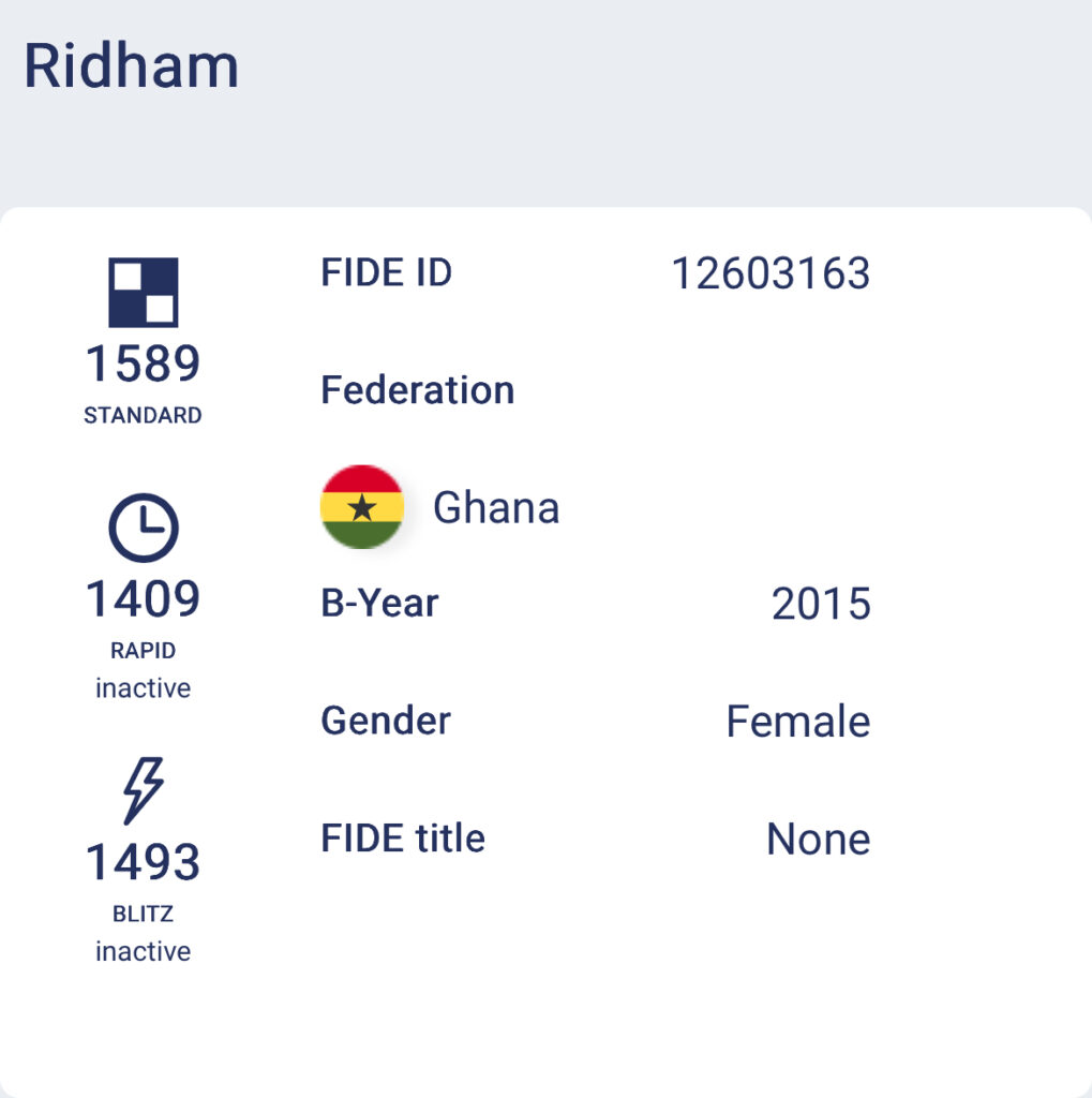 Ridham stands out as an ambassador for Ghanaian chess. With a Standard rating of 1589 and solid scores in Rapid (1409) and Blitz (1493), Ridham’s progress shows the impact of expert chess classes. Her ability to compete internationally underscores ProChess India’s commitment to developing chess globally.