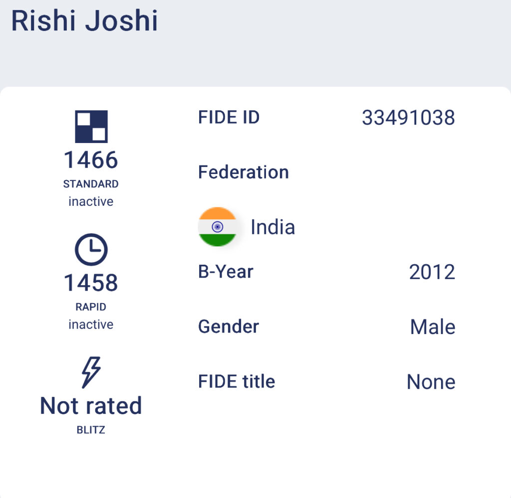 Rishi’s Standard (1466) and Rapid (1458) ratings reflect a disciplined approach to chess study and tournament experience. With ProChess India’s personalized coaching, he continues to advance rapidly through national and FIDE events.