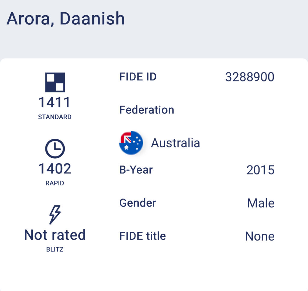Daanish brings Australian energy to the board, with a Standard rating of 1411 and 1402 in Rapid. Although not yet rated in Blitz, his FIDE journey demonstrates great promise, shaped by ProChess India’s training and support for chess talent across continents.