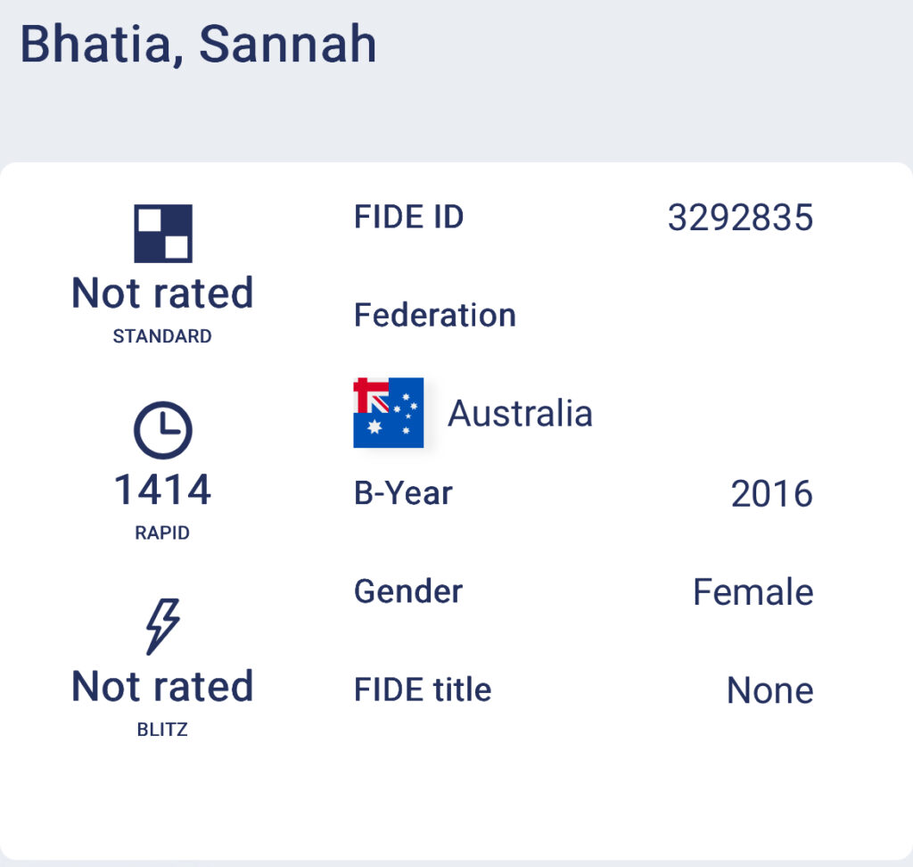 Sannah represents Australia, bringing a fresh perspective to the game. Her Rapid rating of 1414 is remarkable for her age, promising great future achievements through consistent ProChess India training.